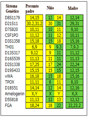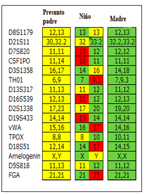 En la figura de arriba, por simplificar solo usamos 16 sistemas genéticos o marcadores. Se puede observar que tanto la madre como el padre han contribuido equitativamente con al perfil genético del niño. En informe escribiremos: NO PUEDE SER EXCLUIDO. La probabilidad de paternidad se establecerá en 99, 99 %.