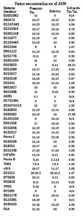 Puede notarse que el sistema genético Amelogenina, tiene letras en lugar de números. Esto es porque este marcador determina el género del individuo: XX es hembra y XY es varón.